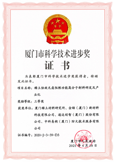 2021年4月,中科易朔(厦门)防火技术服务有限公司参与了中国科学院海西研究院(厦门稀土材料研究所)宋立军课题组负责的“稀土协效无卤阻燃功能高分子材料研发及产业化”项目,并荣获2020年度厦门市科学技术进步三等奖。